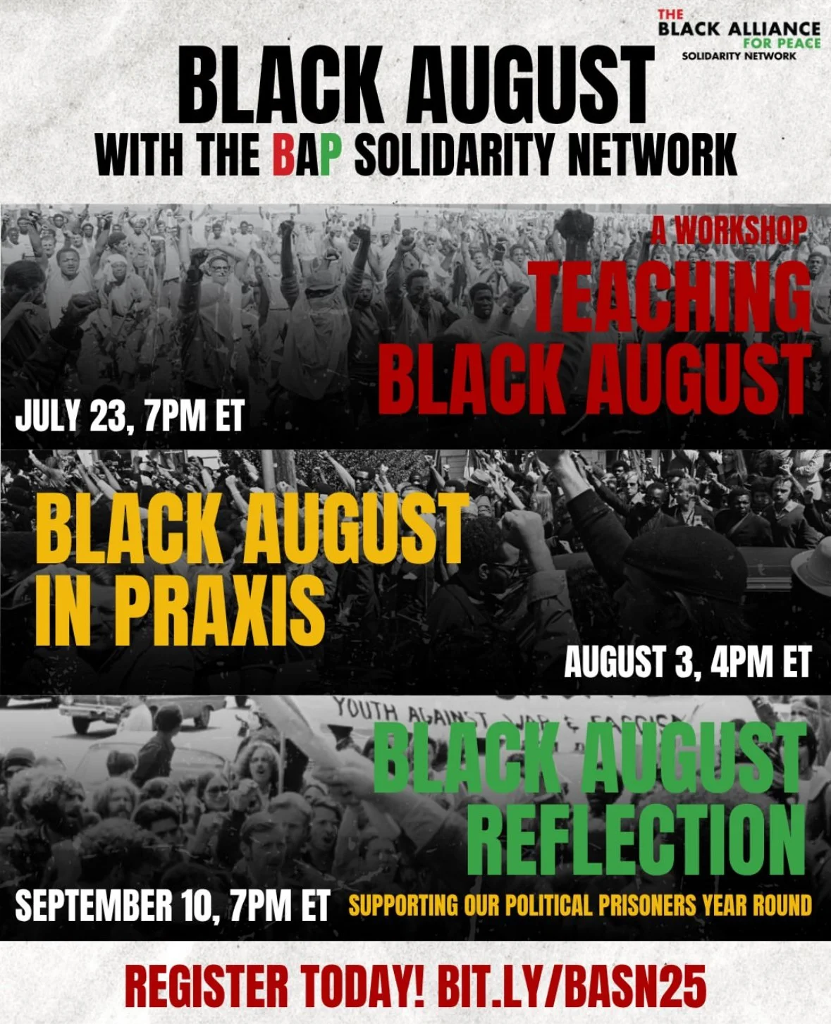 Offering two more virtual sessions for Black August Praxis. They have also developed a Teach-In Guide for organizing your own teach-in or study group! Visit bit.ly/BASN25 to see session dates, materials, and register.